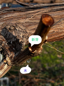 これは「樹液が動き始めた」というサイン。ぶどう栽培ではよく「水が上がる」と言われますが、木が冬の眠りから目を覚まし、いよいよ芽吹きの準備を始めた証拠でもあります。